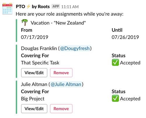 PTO ⚡ by Roots reminds employees of their upcoming time off and helps them assign roles and tasks for co-workers, giving all parties involved greater alignment and peace of mind.