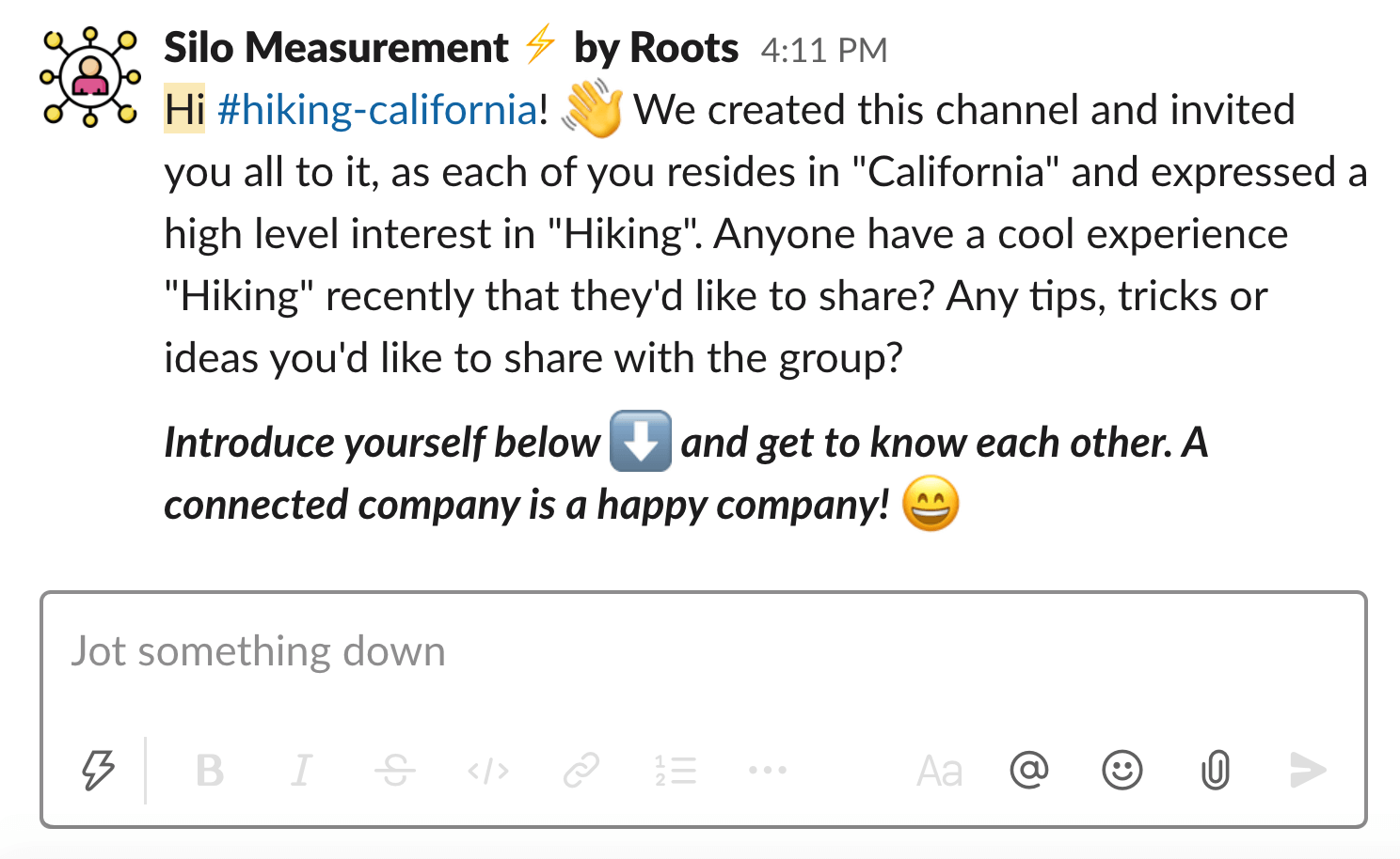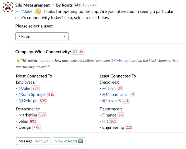 By looking at the various Slack channels employees are in, Silo Measurement ⚡ by Roots provides a simple snapshot of each employee's connectivity with other co-workers, departments, and the organization as a whole. It can even measure the strength of individual connections.